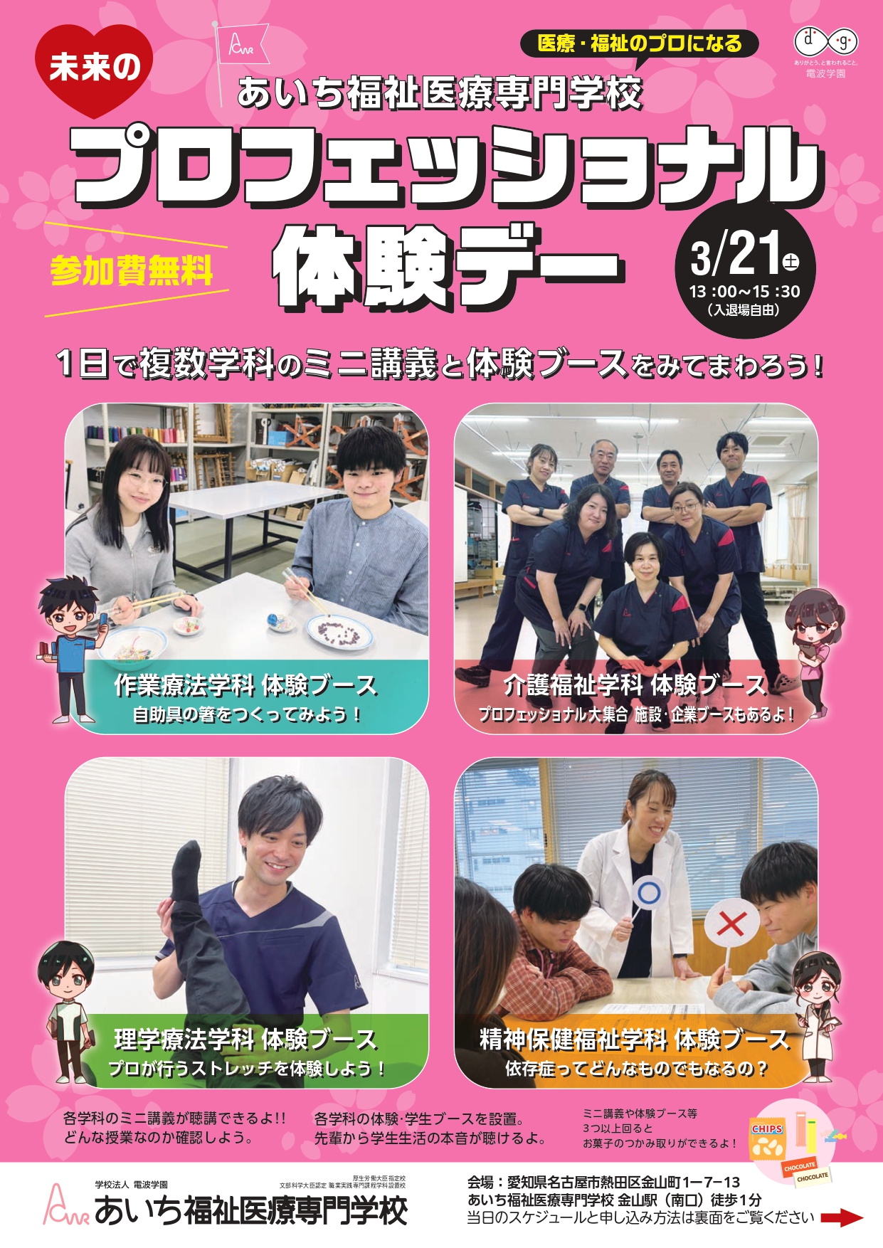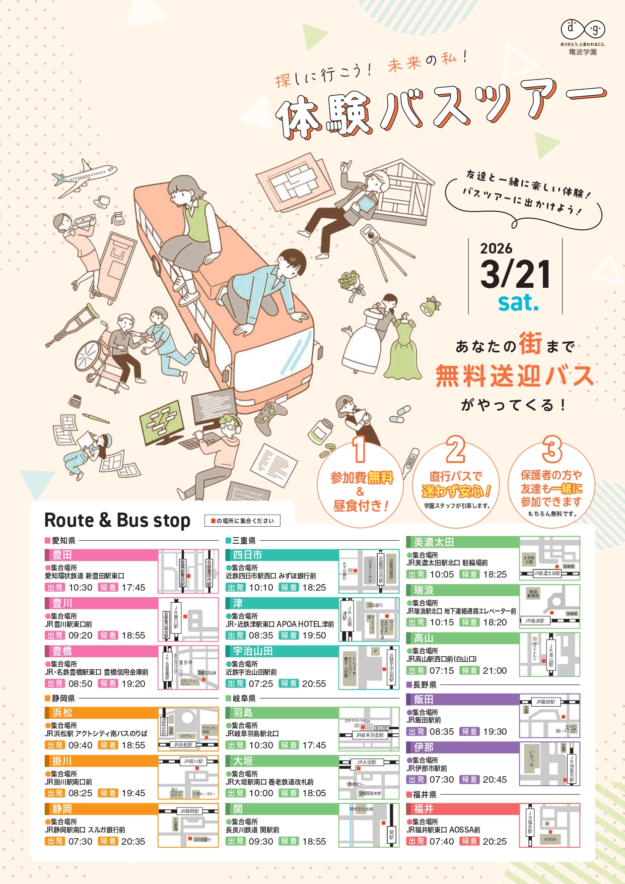 ※3月21日(土)の体験バスツアーは、通常オープンキャンパスではなく、一日で複数学科を自由に見てまわれる、